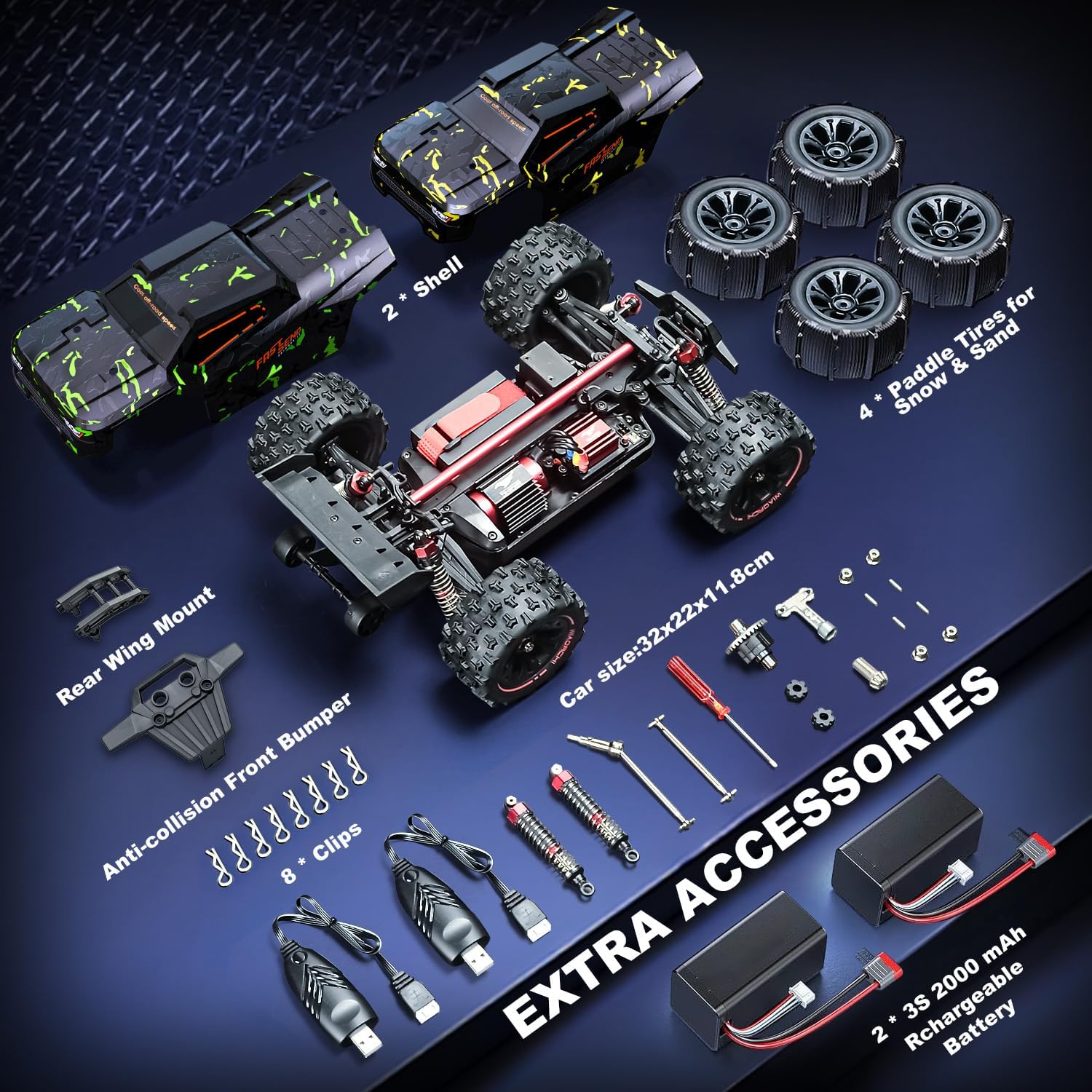 - Release the Monster: This 4×4 RC car can reach an amazing speed of fast 50+ mph 80 km/h, rocketing from 0 to 80 km/h in mere seconds thanks to its 3S power. Dual batteries push your fun to the limit with an incredible 44 minutes of extended playtime!