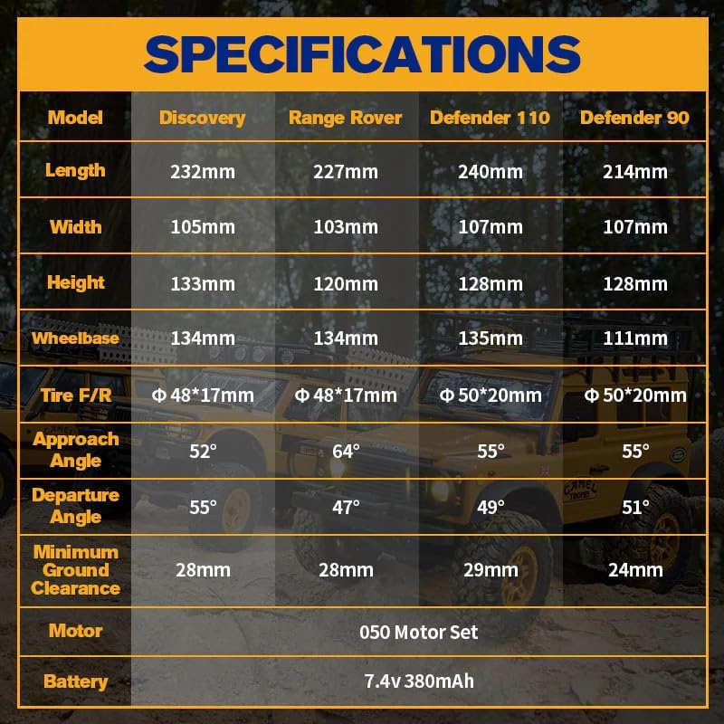- 【Ready for More Adventure】: Those RC cars is ready to start your RC journey once the battery is loaded. Additionally, there are various parts available for players to decorate their Land Rover RC car, such as spare tires, fuel tanks, toolboxes, and extrication plates. This customization allows to create their own unique RC Truck. The Land Rover RC car offers easy setup and customization options, making the rc crawler a versatile and enjoyable choice for RC enthusiasts.