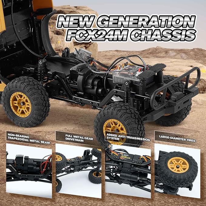 - 【Newly FCX24M Chassis】: Featuring a trapezoidal metal beam non-load-bearing structure for enhanced strength and stability of those 4 rc cars. Front and rear straight axles ensure better replication of the real car, while the addition of a counter-drive system using in te rc car ensures smoother driving. Larger tires provide ample ground clearance and climbing ability for the crawlers. The new FCX24M chassis enhances the stability and performance of the Land Rover rc crawlers.